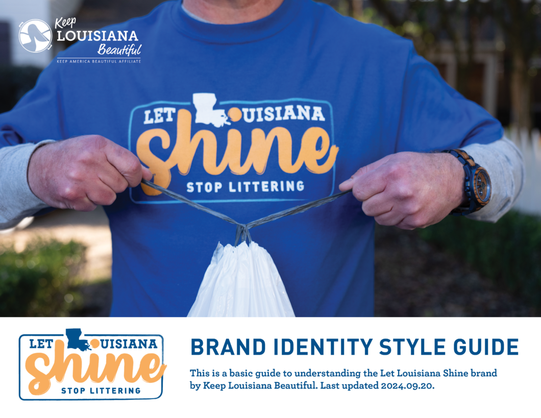 KLB has brand identity style guides for the Keep Louisiana Beautiful brand and the state’s litter prevention campaign, Let Louisiana Shine. Please use these guides when incorporating KLB and Let Louisiana Shine logos into your marketing materials. When using brand logos, KLB encourages you to get feedback and approval from the KLB Director of Communications and Marketing. Contact the Director at [email protected].